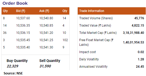At 10:01 AM, the stock was trading at Rs 10543.55 per share on BSE, up Rs 25.45 or 0.24 percent.